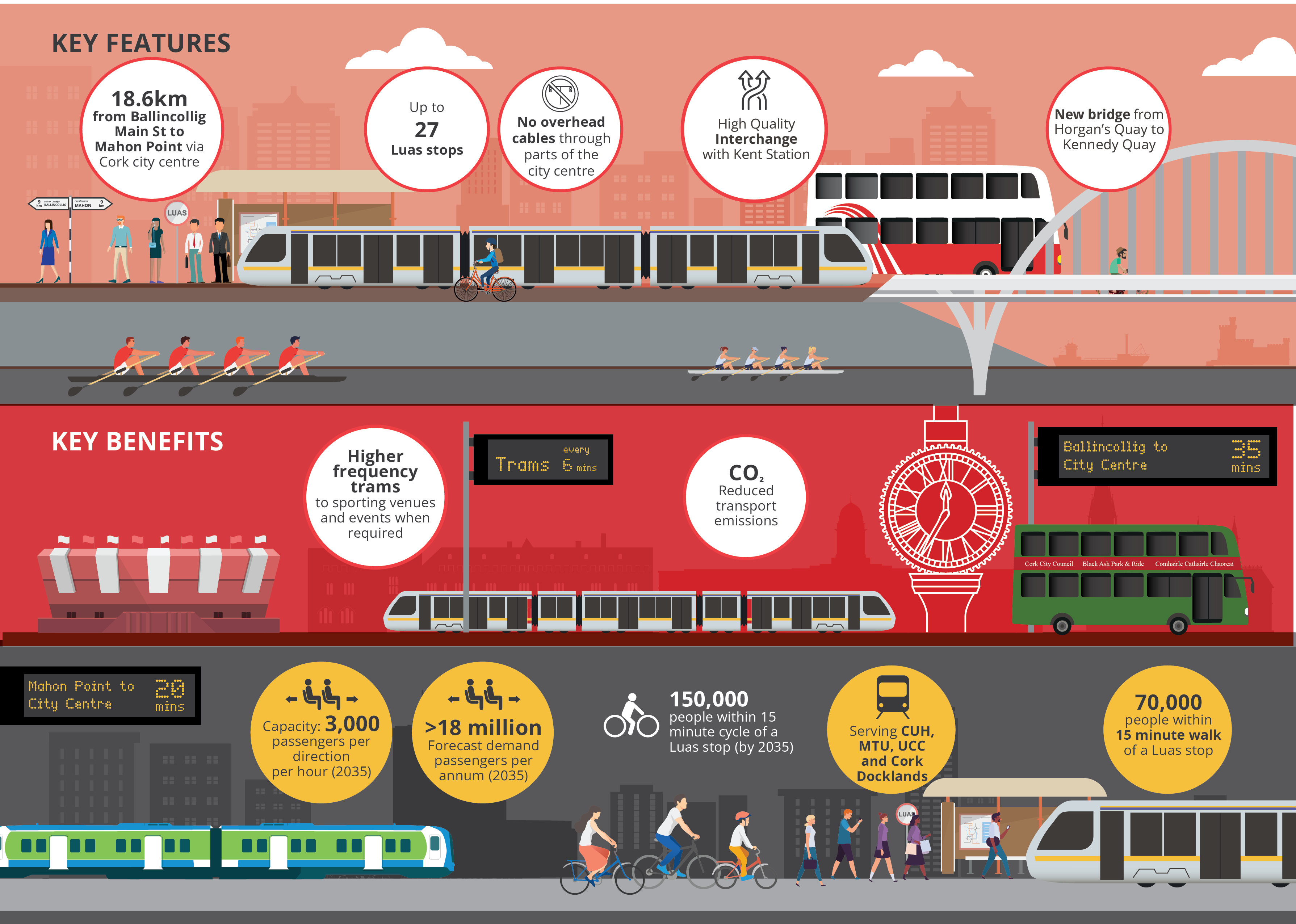 Luas Cork is designed to carry up to 3,000 passengers per hour in each direction at peak times by 2035, with services running every six minutes, and higher-frequency trams to sporting venues and events when required. The projected journey time is 35 minutes from Ballincollig to Cork city centre, and 20 minutes from Mahon Point to the city centre. Forecast demand is more than 18 million passenger journeys per year by 2035, with 70,000 people within a 15-minute walk of a Luas stop and 150,000 within a 15-minute cycle.