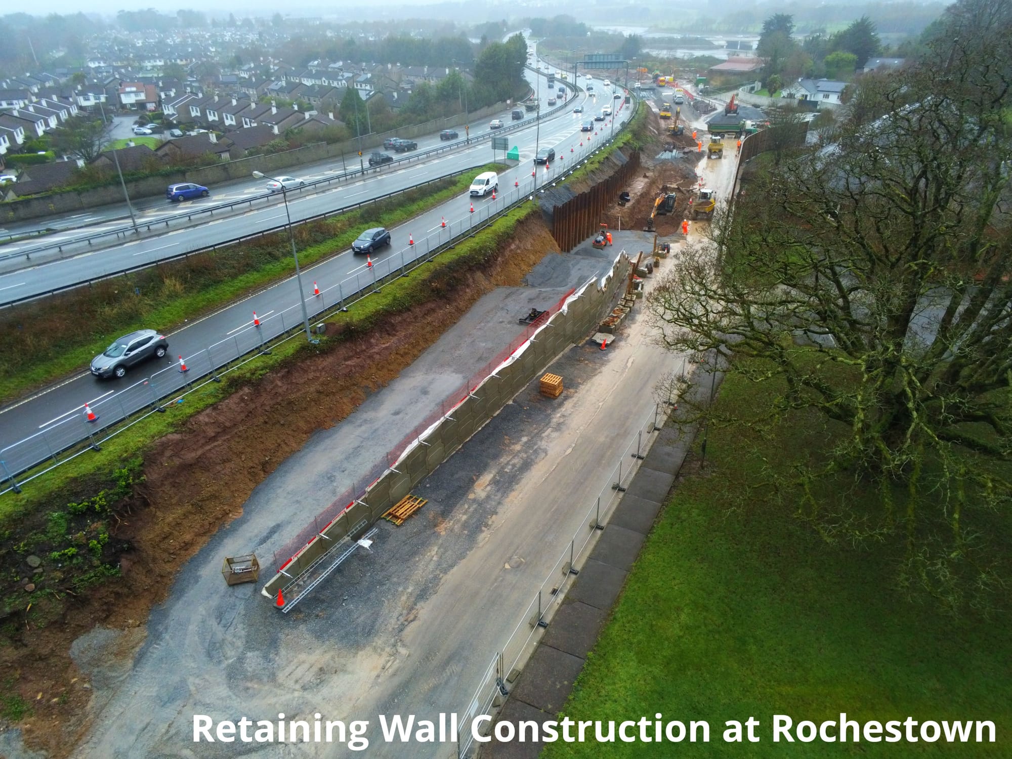 Works are continuing at several key points along the route. In the Rochestown area, construction of the retaining walls near the N28 off-ramp remains ongoing, with progress reported as steady.