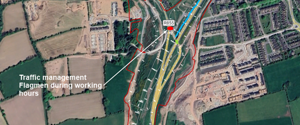 Similar plant-crossing arrangements will be introduced on Ballinrea Road in the coming weeks, with flagmen operating during working hours. Intermittent traffic management will continue on Board of Works Road for plant crossings, subject to weather conditions.