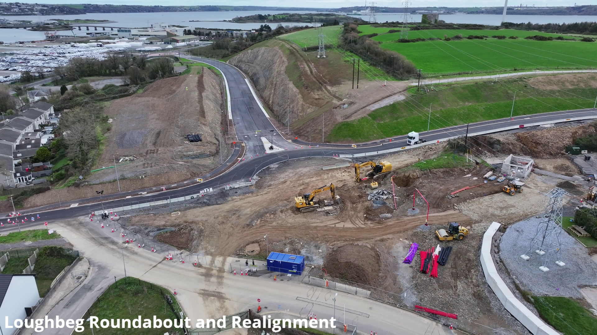 Two-way traffic has been restored on the realigned L6517 at Loughbeg, running on a temporary contraflow arrangement on the eastern side of the roundabout. Works continue at the western side of the roundabout and on the new access road into Ringport Business Park.