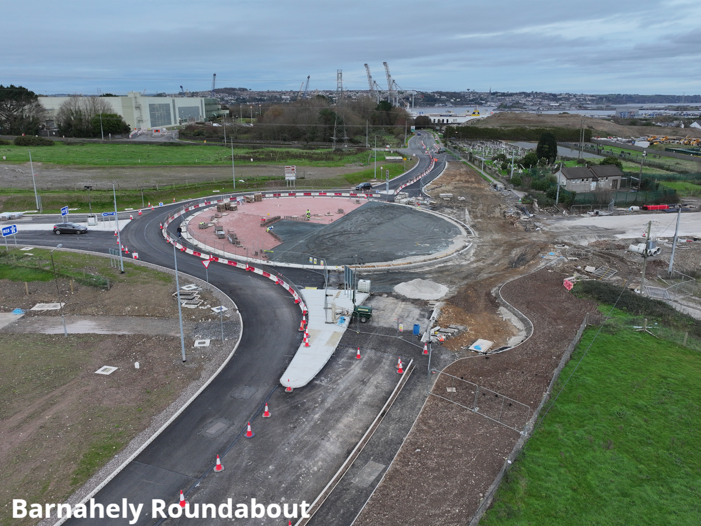 At Barnahely Roundabout, traffic continues to operate on the northbound lane under a one-way system. Works on the eastern and northern approaches are expected to be completed by mid-December, when the roundabout and its approaches are anticipated to open to two-way traffic. Focus will then shift to the J&J junction and the northern tie-in, including construction of two new bus stops.
