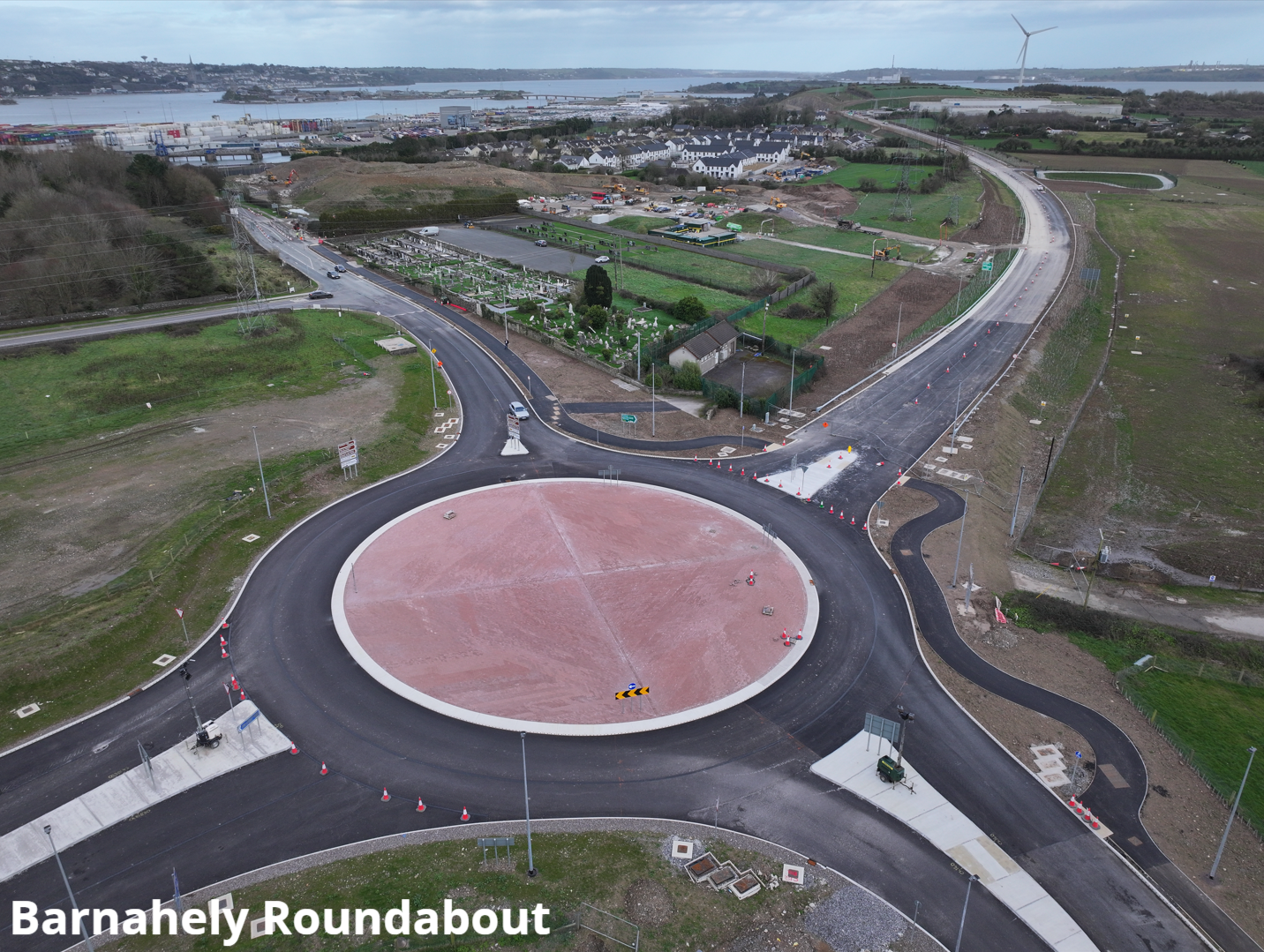 The main focus of works continues at the Loughbeg Roundabout. Surfacing works have been completed on the western half of the roundabout and adjacent residential and business park entrances. Installation of drainage and ducting is complete, with brick paving of the roundabout central island, fencing, and landscaping now advancing rapidly. Two-way traffic will continue on a temporary contraflow arrangement on the eastern side of the roundabout until these works are complete.