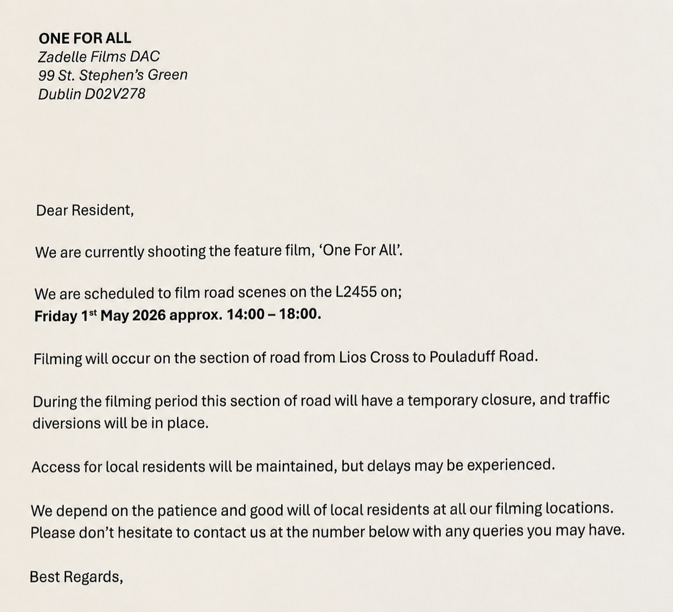 A letter sent to local residents by Dublin-based production company Zadelle Films DAC has confirmed that the L2455, on the stretch between Lios Cross and Pouladuff Road, will be closed for filming on Friday, 1 May 2026, from approximately 2pm to 6pm. Traffic diversions will be in place for the duration.