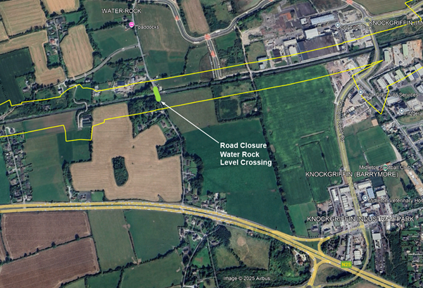 The closure at Water Rock level crossing will run from 27 October to 23 November 2025 as part of the €90 million Glounthaune to Midleton Twin Tracking project. The crossing will be widened and rearranged to make room for the additional track, with traffic diversions in place throughout the works.